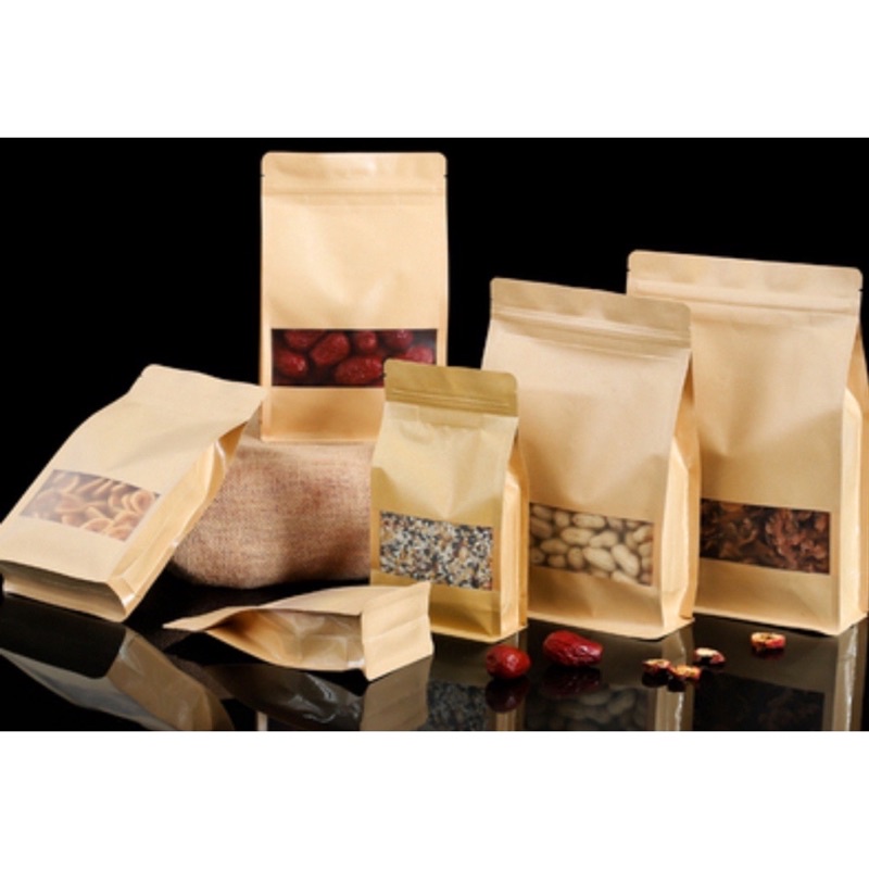 {Thử mẫu 1 cái/ size} Túi zipper giấy Kraft Vàng 8 CẠNH đáy đứng cửa sổ tràn có CÁN MÀNG - CHỐNG THẤM NƯỚC (sp y hình)