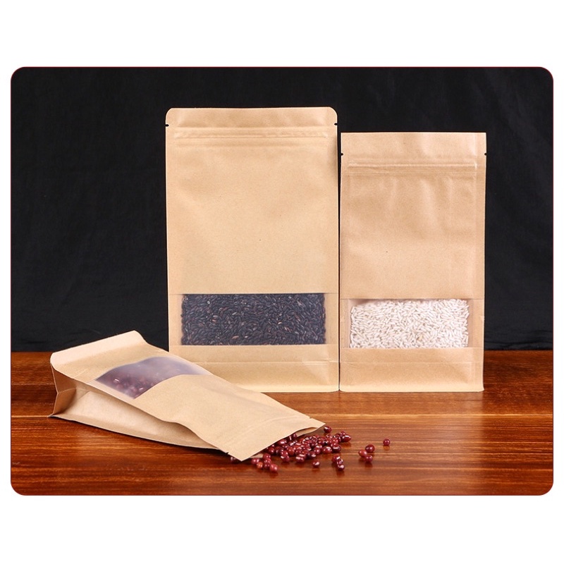 + Cấu tạo túi: bên trong là lớp nhựa trong (có cửa sổ như hình), bên ngoài là lớp giấy Kraft có cán màng