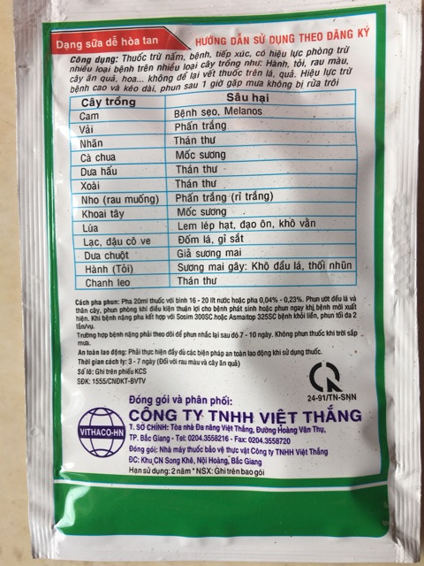 Công dụng: chuyên trị các loại bệnh hại cây trồng như thán thư, phấn trắng, héo cây con, đốm lá, sương mai, mốc sương, bệnh sẹo, giả sương mai, đạo ôn, khô vằn,.....Hướng dẫn sử dụng: hoà tan 10~15ml/10~12 lít nước phun cho cây vào sáng sớm hoặc chiều mát.