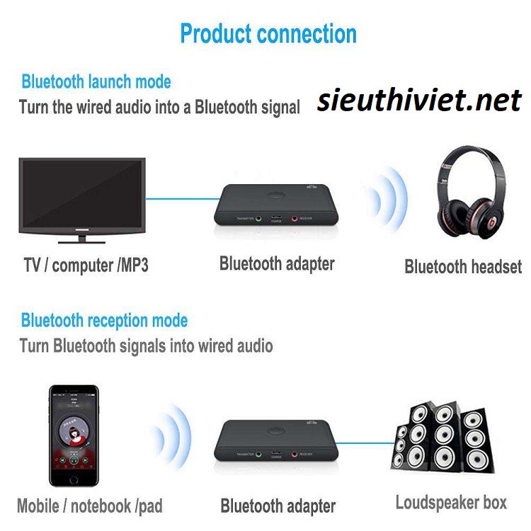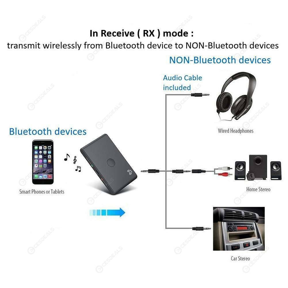 * Chế độ nhận : ( RX ) Thay đổi hệ thống Car Stereo truyền thống hoặc Hệ thống Âm thanh Gia đình sang các thiết bị Bluetooth. Sau khi ghép nối, phát nhạc không dây từ điện thoại thông minh, máy tính xách tay, máy tính bảng và nhiều hơn nữa.