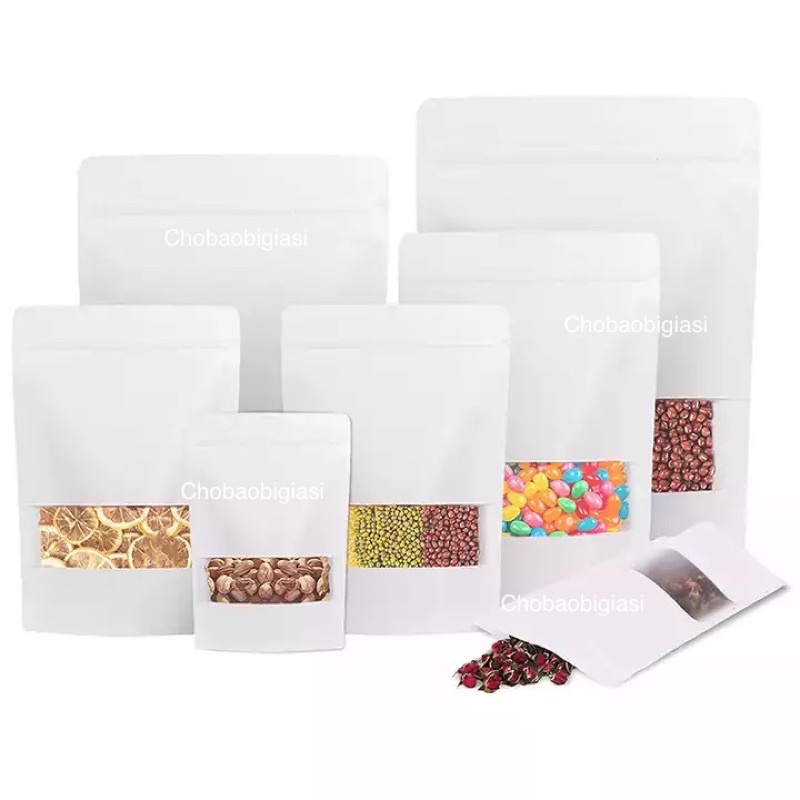 {Thử size 1 cái/ size} Túi zipper giấy Kraft MÀU TRẮNG đáy đứng cửa sổ tràn có CÁN MÀNG - CHỐNG THẤM NƯỚC (sp y hình)