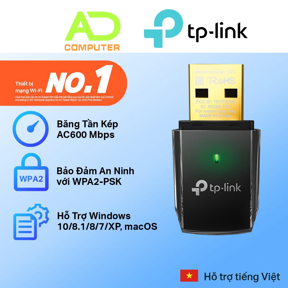 Thiết kế gọn nhẹ - dễ dàng mang theo.USB Wifi Tplink Archer T2U với thiết kế nhỏ gọn và kiểu dáng đẹp mắt, thiết bị này nhỏ hơn hầu hết các adapter USB WI-FI 11ac hiện có và dễ mang theo trên đường. Người dùng có thể kết nối adapter mini với bất cổng USB nào.