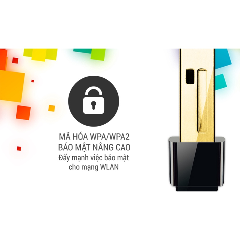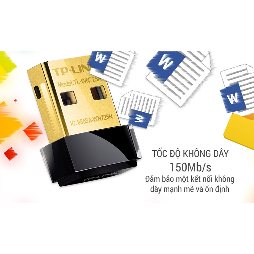 Bô chuyển đổi USB Nano chuẩn N không dây tốc đô 150Mbps TL-WN725N của TP-LINK cho phép người dùng kết nối một máy tính để bàn hoặc máy tính xách tay với mạng không dây tốc độ 150Mbps. TL-WN725N được thiết kế để mạng lại tính thuận tiện cao nhất cho người dùng, khi đã kết nối vào cổng USB của máy tinh thì có thể để lại đó, cho dù đi du lịch hay ở nhà. Thiết bị cũng sở hữu tính năng mã hóa không dây nâng cao và dễ dàng cài đặt.