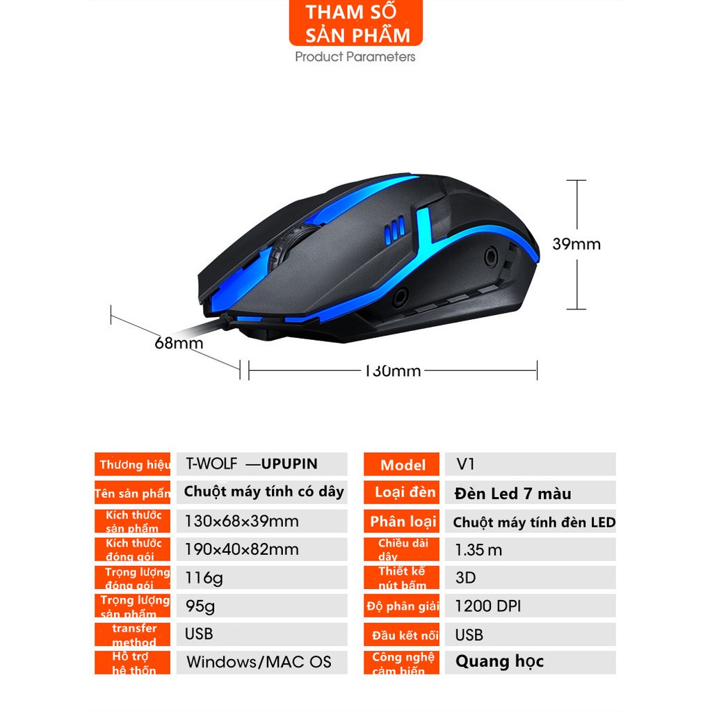 Giới thiệu Thunder Wolf có dây chuột chơi game dạ quang đầy màu sắc Máy tính để bàn USB