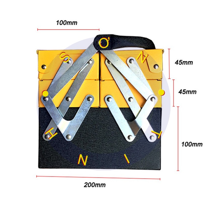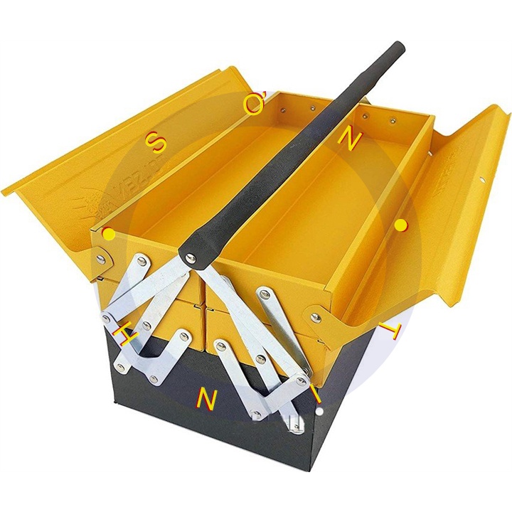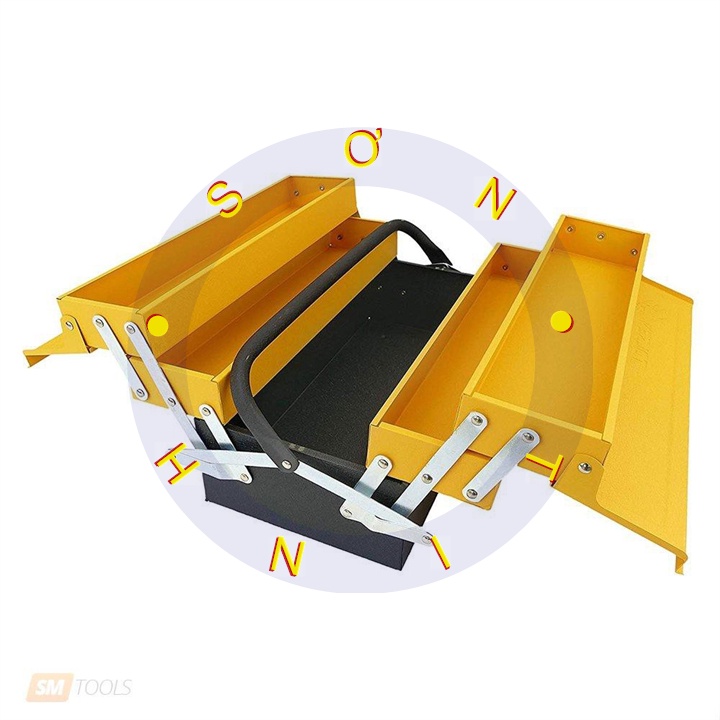 4 tầng nhỏ và 1 thùng lớn ở đáy hộp, giúp chia đồ nghề gọn gàng, dễ tìm kiếm, tránh gây va chạm, hư hỏng dụng cụ