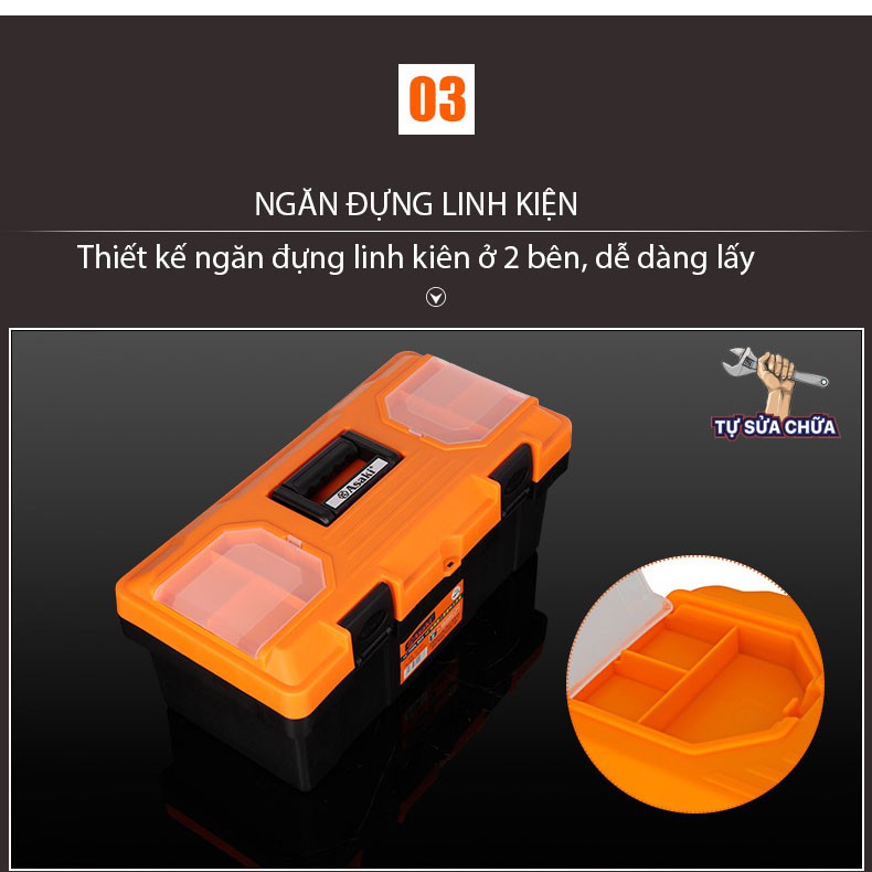 + Hộp đựng đồ nghề là một sản phẩm đựng đồ đầy tiện dụng và mang tính năng động cao. Sản phẩm làm bằng chất liệu nhựa, rất nhẹ để di chuyển. Khóa và tay xách bằng nhựa cũng góp phần hỗ trợ bạn khi muốn di chuyển thùng. Chiếc thùng đựng đồ có kích thước tương đối lớn nên sẽ giúp bạn chứa được rất nhiều vật dụng kỹ thuật luôn gọn gàng, ngăn nắp.