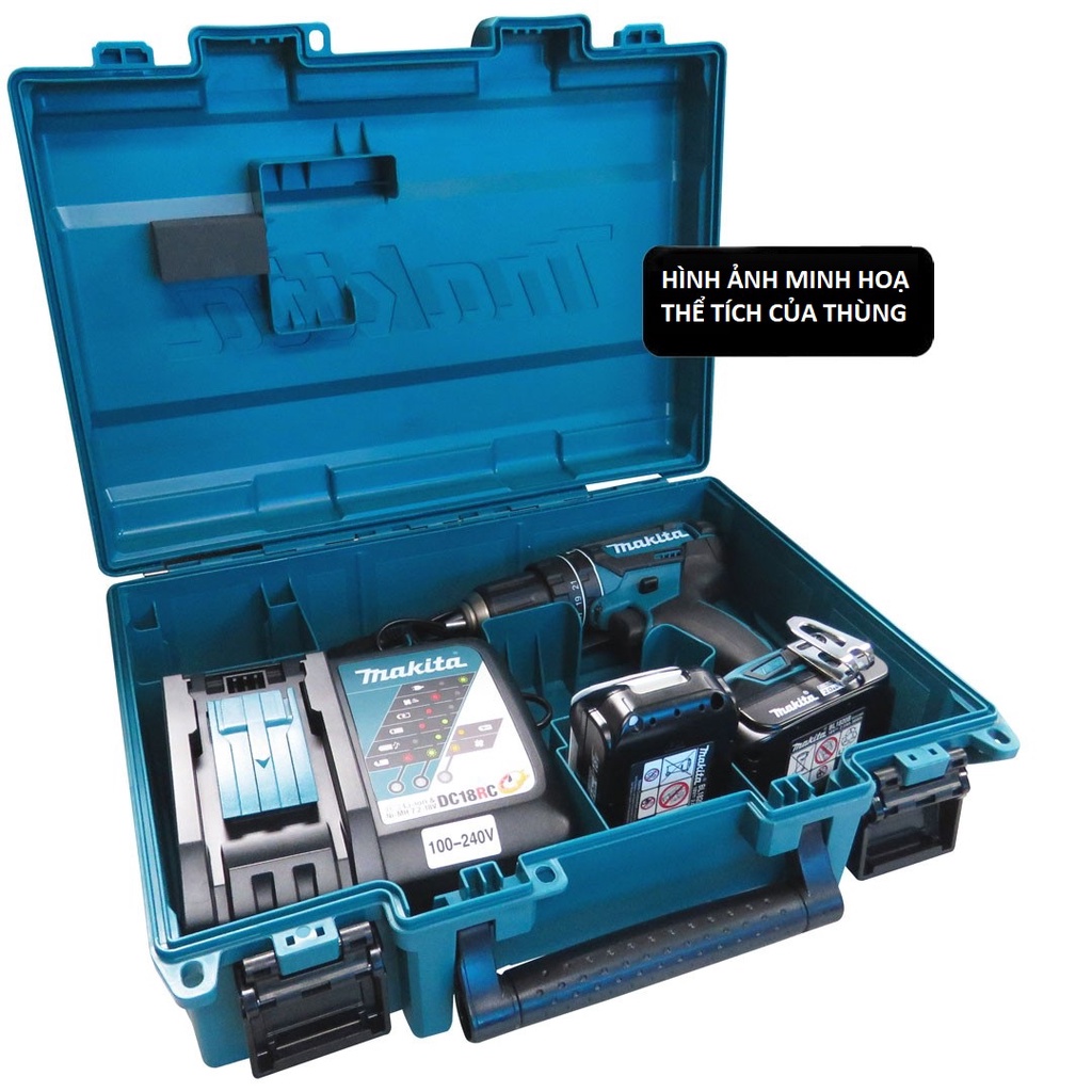 Có thể đựng được combo tiêu chuẩn gồm: 1 máy (khoan hoặc bắn vít hoặc siết bu lông thuộc dòng 18v Makita), 2 pin, 1 sạc và kèm các phụ kiện mũi khoan, mũi vít....