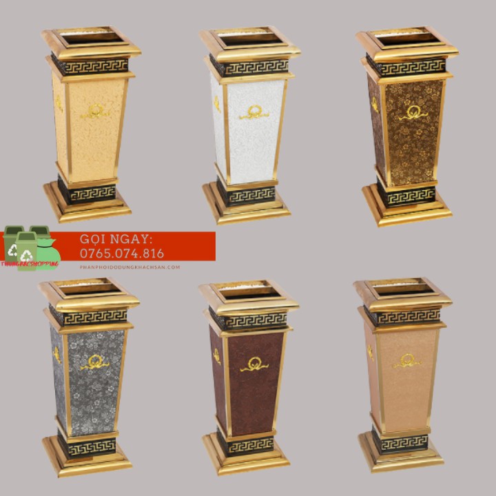• Bốn mặt thùng rác đá được bọc da hoa văn bắt mắt, xen kẽ phần khung inox mạ vàng tạo nên vẻ sang trọng, lịch sự cho không gian sử dụng.