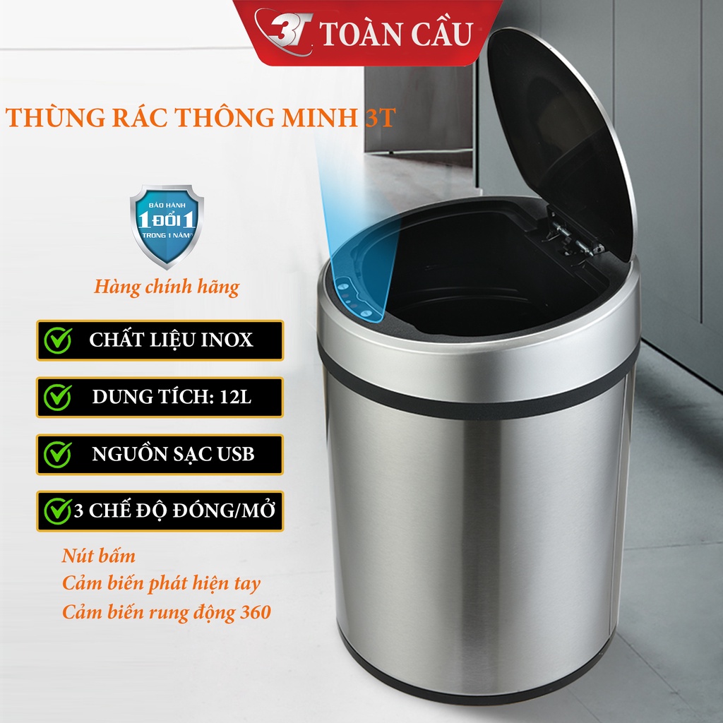 Thùng rác cảm ứng thông minh 3T - Chất liệu Inox cao cấp, dung tích 12LTÍNH NĂNG: