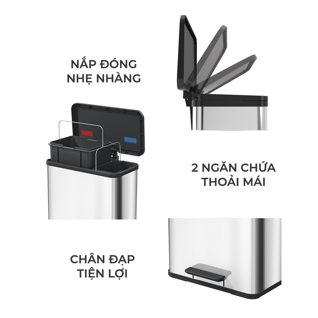 Bên trong thùng có 2 ngăn chứa 17L và 9L giúp việc phân loại rác thải trong nhà trở nên dễ dàng, đảm bảo vệ sinh gọn gàng, sạch đẹp cho ngôi nhà của bạn. Thùng chứa làm bằng chất liệu nhựa tái chế 100% thân thiện với môi trường.