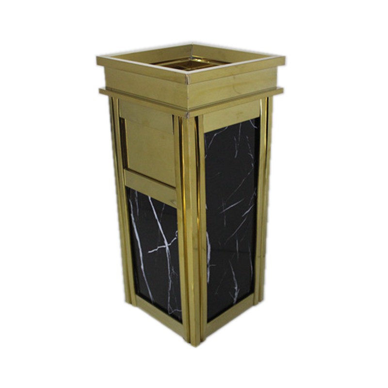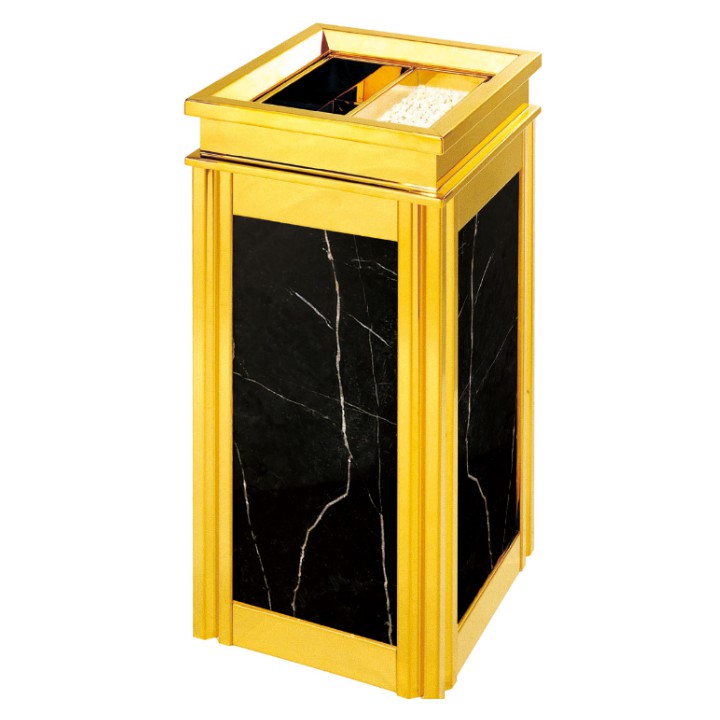 • Thùng rác đá hoa cương với 4 mặt đá hoa cương dày dặn, có màu đen bóng sang trọng, kết hợp với viền inox mạ vàng đã toát lên sự đẳng cấp, tôn lên vẻ đẹp lịch sự, thanh lịch cho không gian nhà hàng, khách sạn.