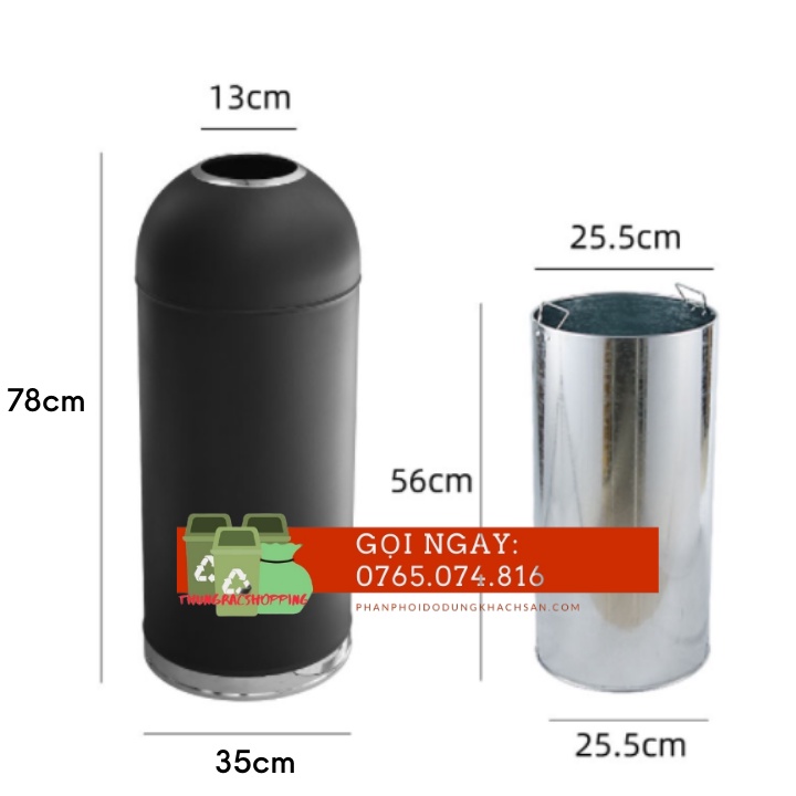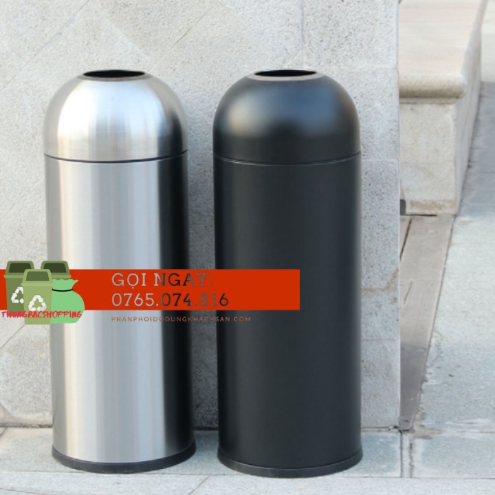 - Thùng rác inox hình tròn (trụ) có nắp kiểu hở (lỗ tròn hở), rác bỏ trực tiếp vào thùng.