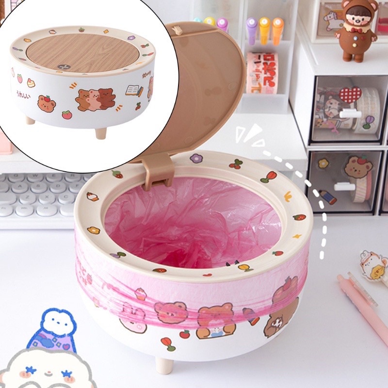 Thùng rác mini để bàn có nắp bấm co giãn Nắp đậy phim hoạt hình dễ thương in hình gấu cao chân tròn Thùng rác