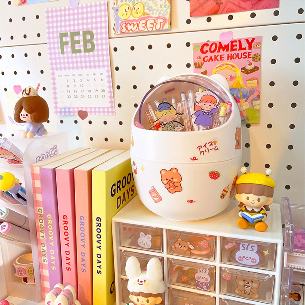 Thùng rác mini để bàn Thùng rác hình gấu có nắp xinh xắn dễ thương-tặng sticker – Hộp đựng bút đa năng
