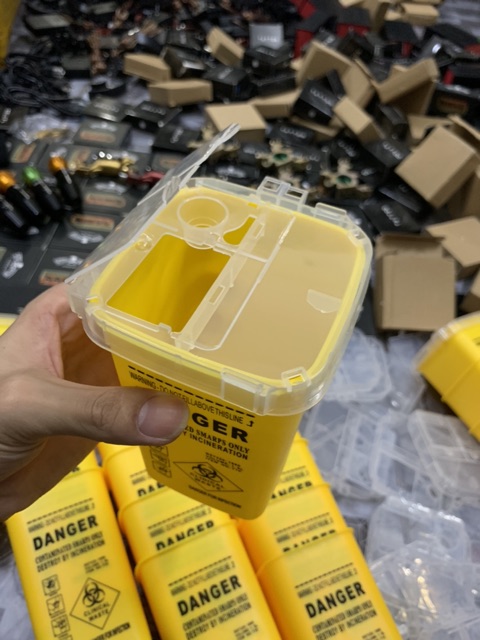 Một cửa hàng xăm chuyên nghiệp chắc chắn sẽ không thể thiếu một sản phẩm nhỏ nhắn nhưng cần thiết này- sản phẩm từ nhựa có nắp đậy . Khi sử dụng kim xong các bạn sẽ mở nắp ra và bỏ kim cũ vào và đổ đi khi thùng đầy