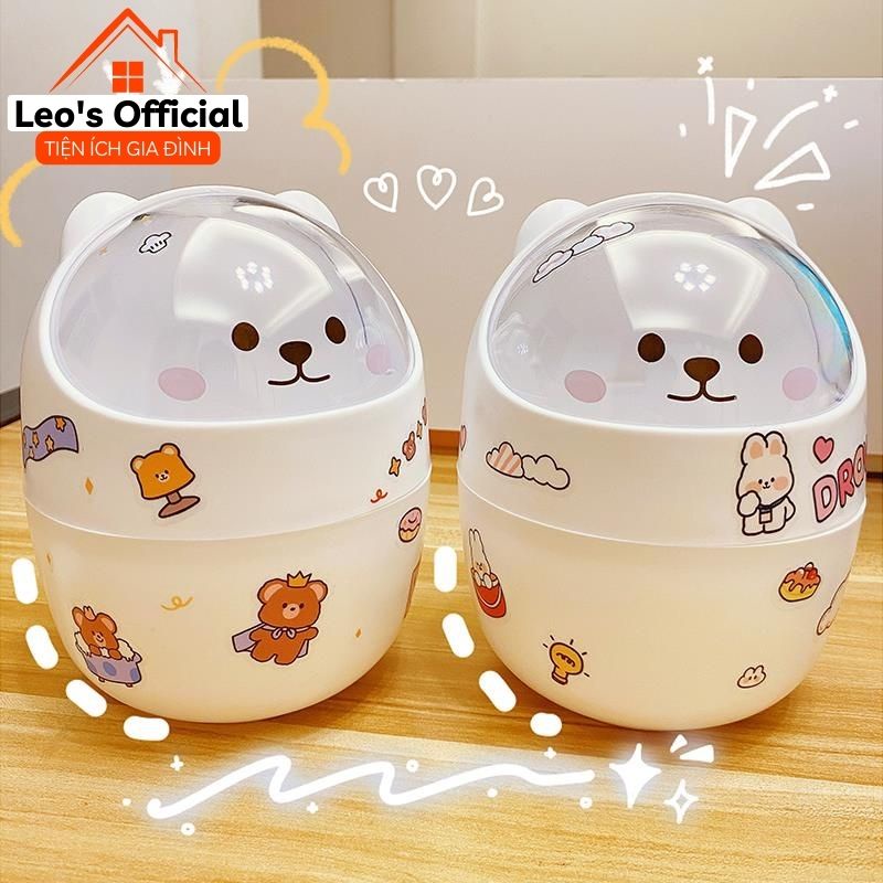 Thùng rác thông minh mini để bàn đựng bút hình gấu nắp lật tiện lợi Leos