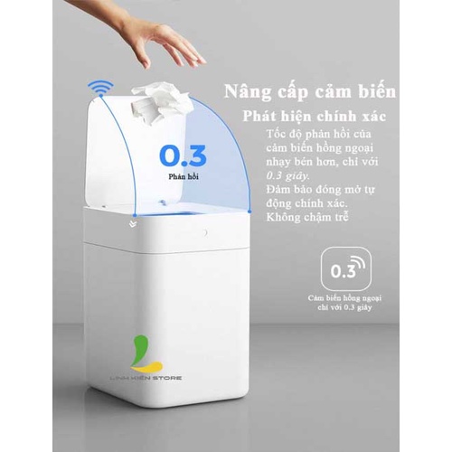 - Cảm biến không chạm 3.0 : cảm biến hồng ngoại thông minh. Khi người dùng đưa bàn tay vào vùng cảm biến trên mặt thùng rác thì nắp sẽ tự động mở chỉ sau 0.3s và tự động đóng lại sau 10s. Xây dựng một kỷ nguyên mới – Cảm biến không chạm. Nâng cấp tốc độ nhanh nhạy và đảm bảo đóng/mở tự động chính xác, không chậm trễ.