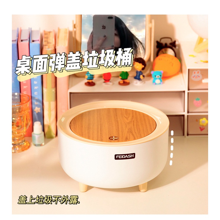 Thùng rác tròn mini nắp bật vân gỗ để bàn học, decor trang trí siêu xinh