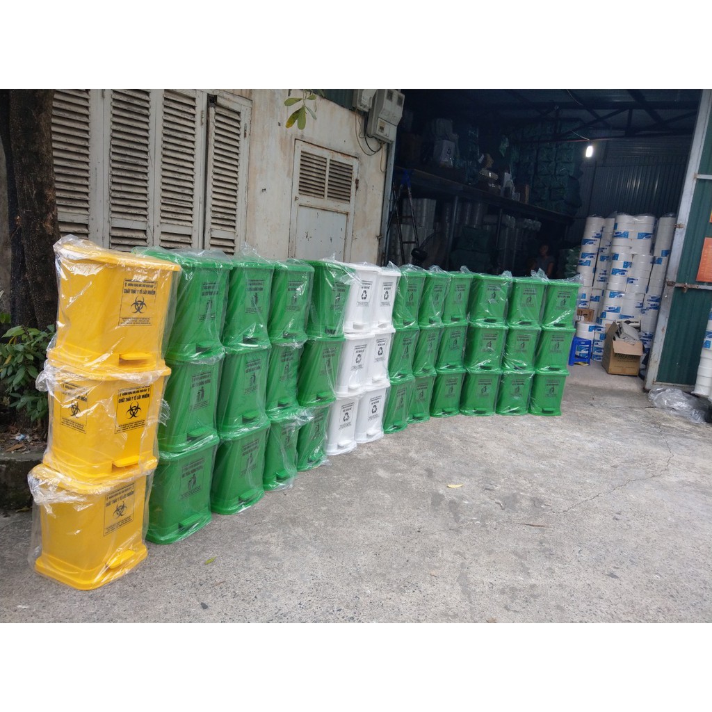 - Cấu tạo: Dạng thùng rác y tế có nắp đậy kín, có đạp chân để mở nắp, lõi đựng rác bên trong có quai xách.