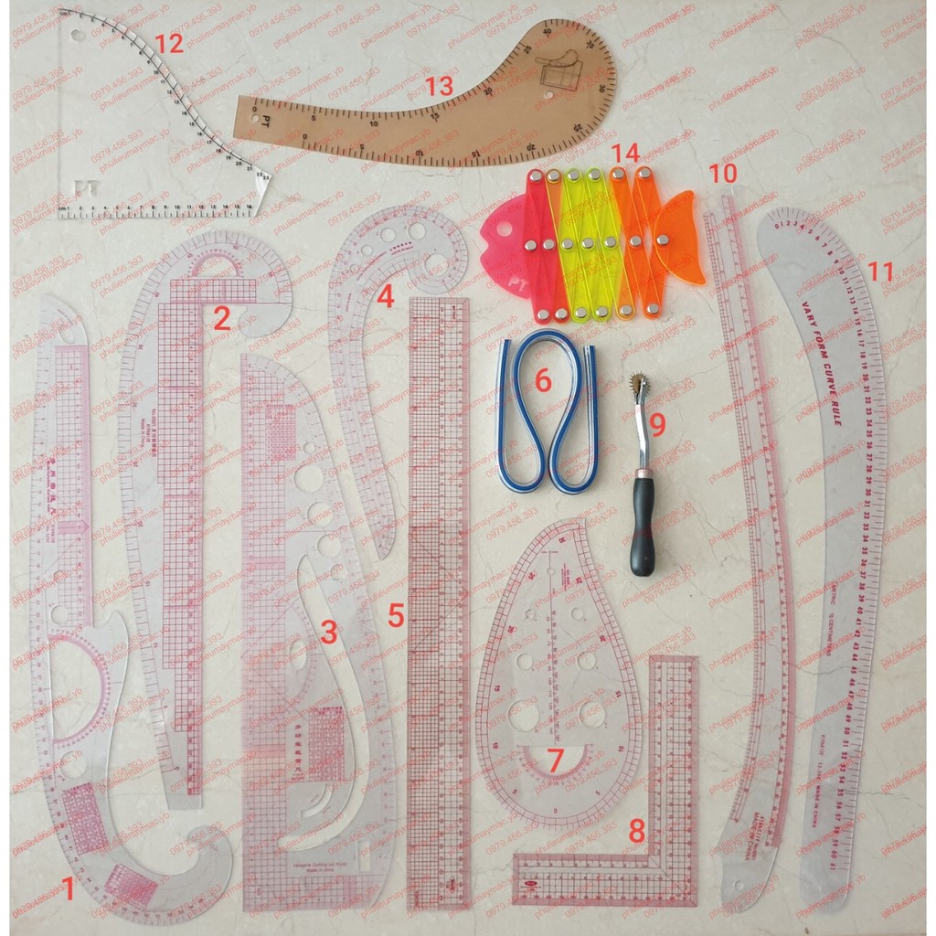 bộ thước 11 món (ko có số 6: thước dẻo lõi nhôm, ko có số 9: lăn sang dấu, ko có số 14: thước chia khuy)
