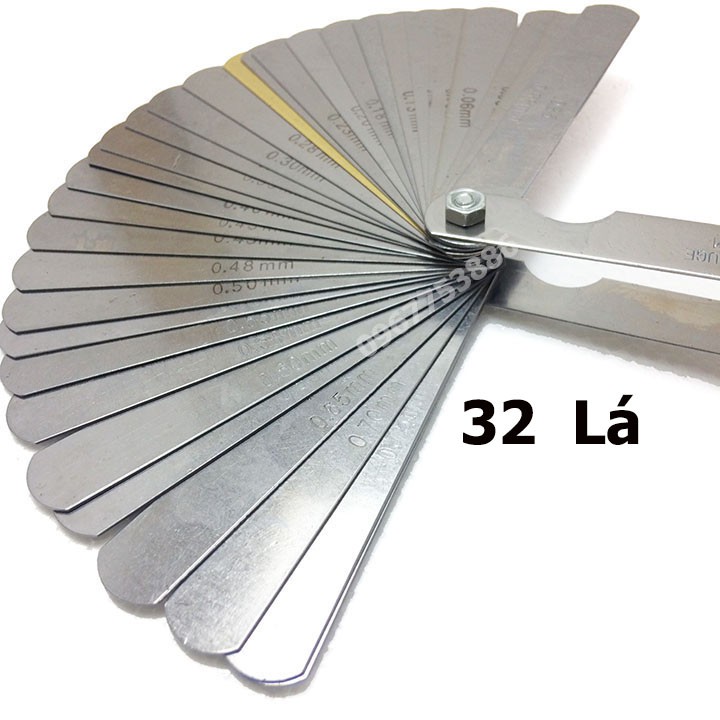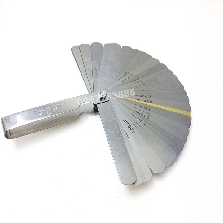 Thước căn lá 0.02-1.0mm, bao gồm 32 lá.-Chiều dài lá 89mmCó nhiều cách gọi khác nhau của loại dụng cụ đo khe hở này như thước lá, thước căn lá (vì nó như cái lá cây), thước nhét (dùng nhét vào khe hở).v.v Ở đây ta gọi chung là thước căn lá hay thước lá dùng để căn đo khe hở