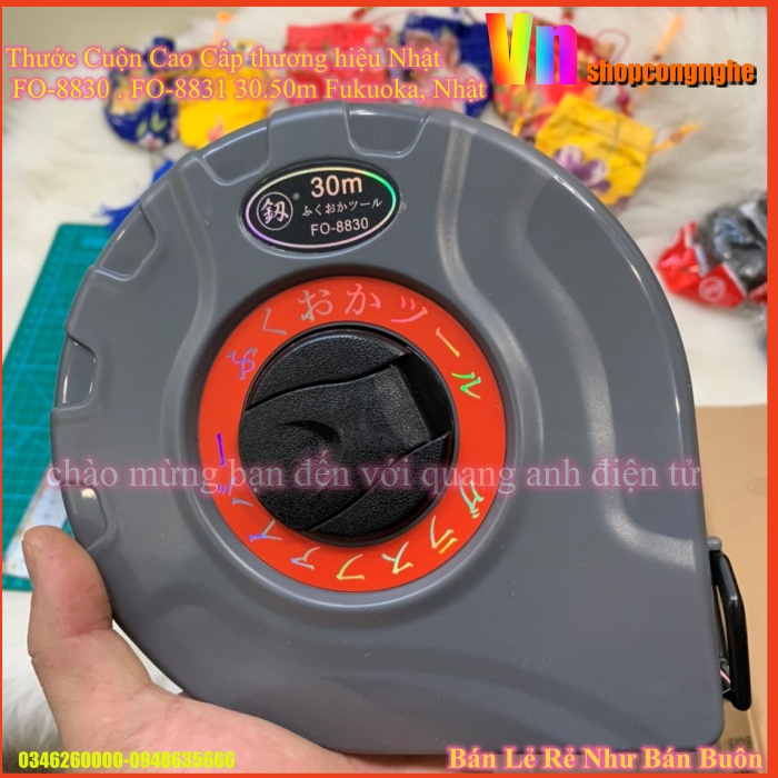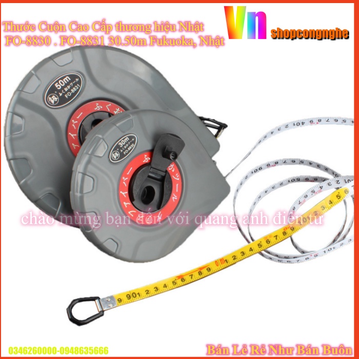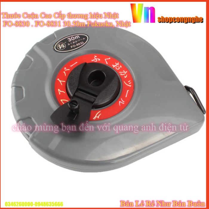 Thước Cuộn Cao Cấp thương hiệu Nhật FO-8830 . FO-8831 30.50m+ thước cuộn 30m 50m vỏ được chế tạo bằng chất liệu nhựa tổng hợp siêu bền, sợi thước được chế tạo bằng sợi thủy tinh tổng hợp siêu bền, không co giãn khi sử dụng đạt độ chính xác cao, số được in hai mặt rõ ràng bằng mực in cao cấp chống mờ, chống xước