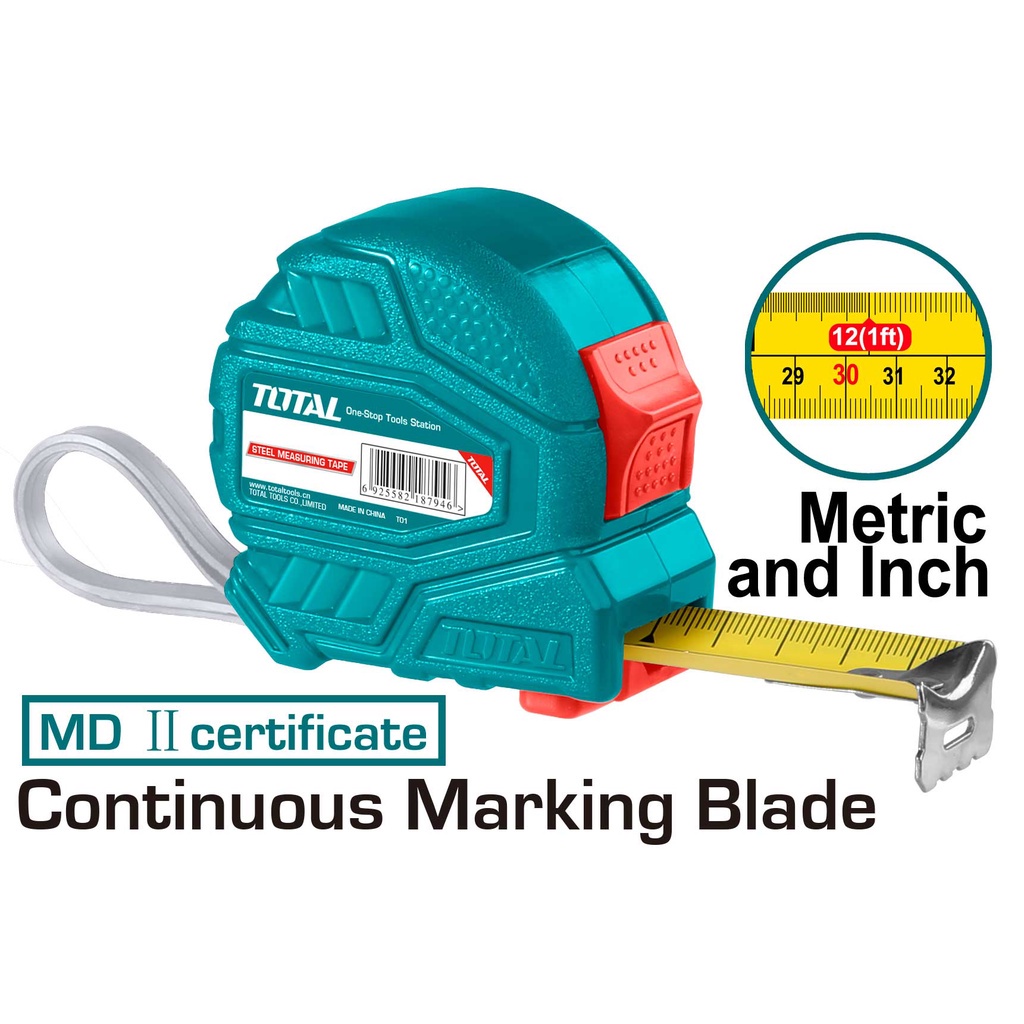 Thước cuộn thép Total luôn tạo cảm giác thoải mái cho người sử dụng, với lá thước thiết kế cuộn trong hộp nên rất gọn gàng, không làm rối thước. Sản phẩm có kiểu dáng nhỏ gọn, giúp người thợ sử dụng đo đạc ở nhiều nơi chật hẹp, khó di chuyển. Thước là người bạn đồng hành không thể thiếu trong các ngành công nghiệp, xây dựng, mộc, lắp đặt….