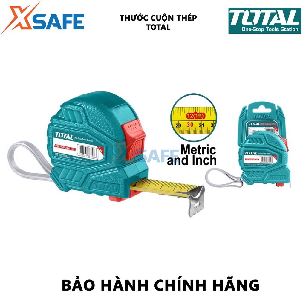 - Phần đầu dây thước được tích hợp khóa kim loại, giúp dễ dàng kéo ra khi đo, thật tiện dụng! Thước cuốn thép Total sử dụng thang đo hệ mét và inch, chi tiết và số đo được in rõ ràng trên lá thước, cho người dùng dễ dàng đọc kết quả đo.