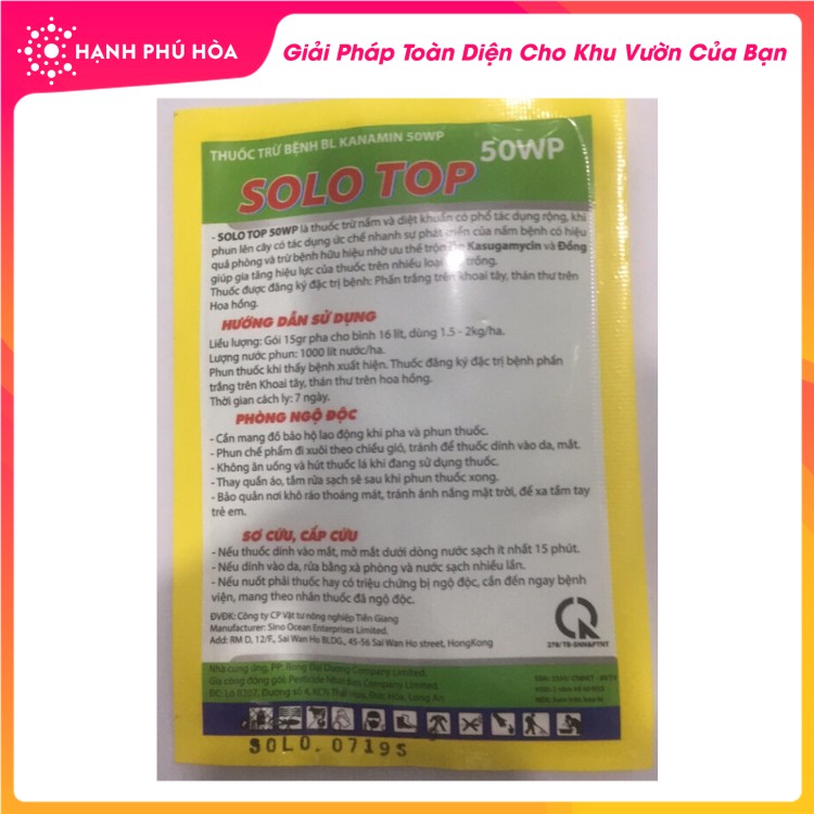 SOLO TOP 50WP là thuốc trừ nấm và diệt khuẩn phổ tác dụng rộng. Thuốc diệt khuẩn có hiệu quả phòng và trừ bệnh hữu hiệu. Khi phun lên cây có tác dụng ức chế nhanh sự phát triển của nấm bệnh. Tất cả là nhờ ưu thế trộng lẫn Kasugamycin và Đồng. Sự trộn lẫn này đã gia tăng hiệu lực của thuốc trên nhiều loại cây trồng.