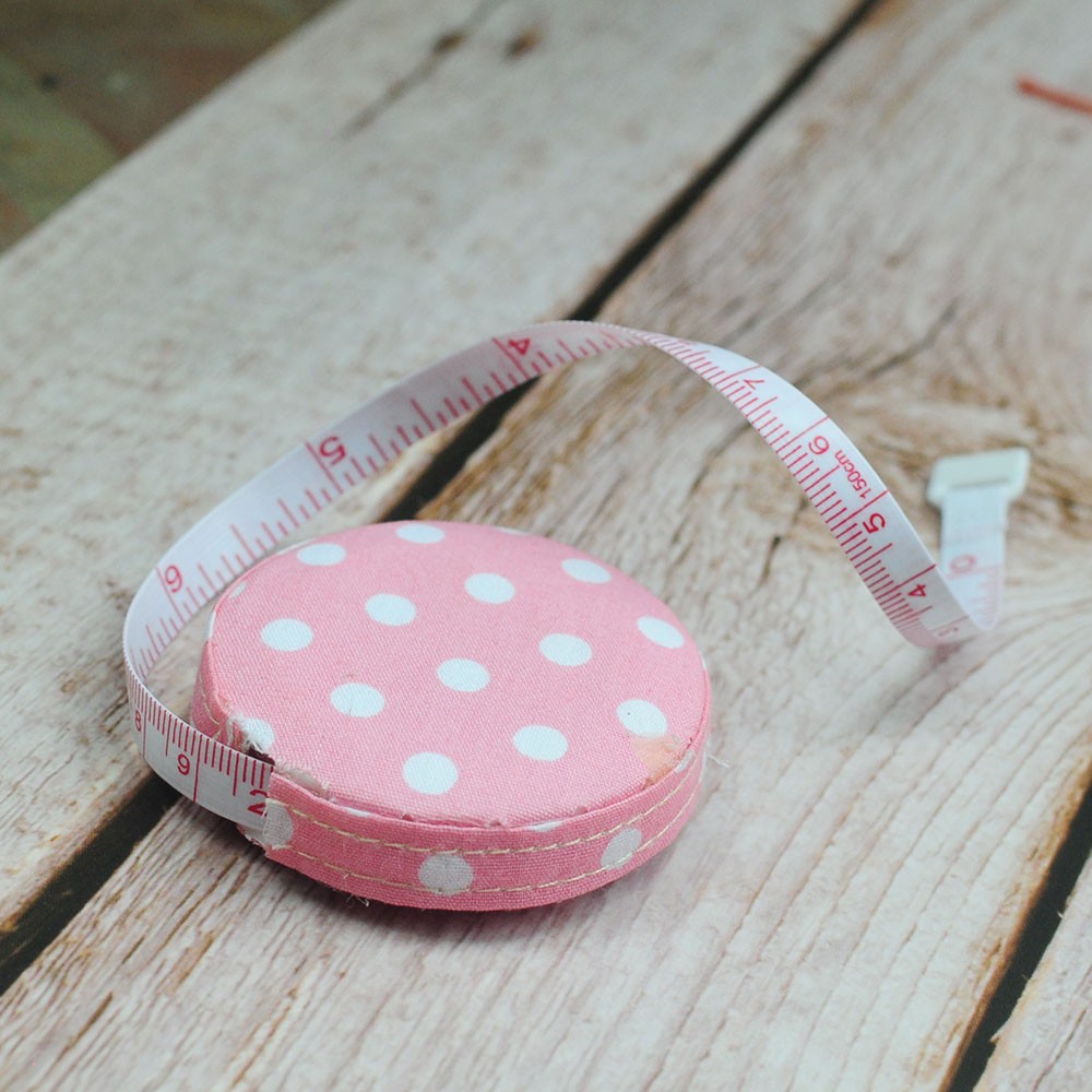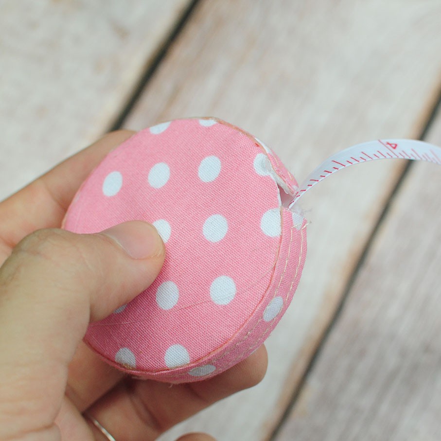 Thước dây cuộn được thiết kế dạng hộp đựng, bên ngoài bọc vải hồng xinh xắn.Đường kính hộp 5cm.
