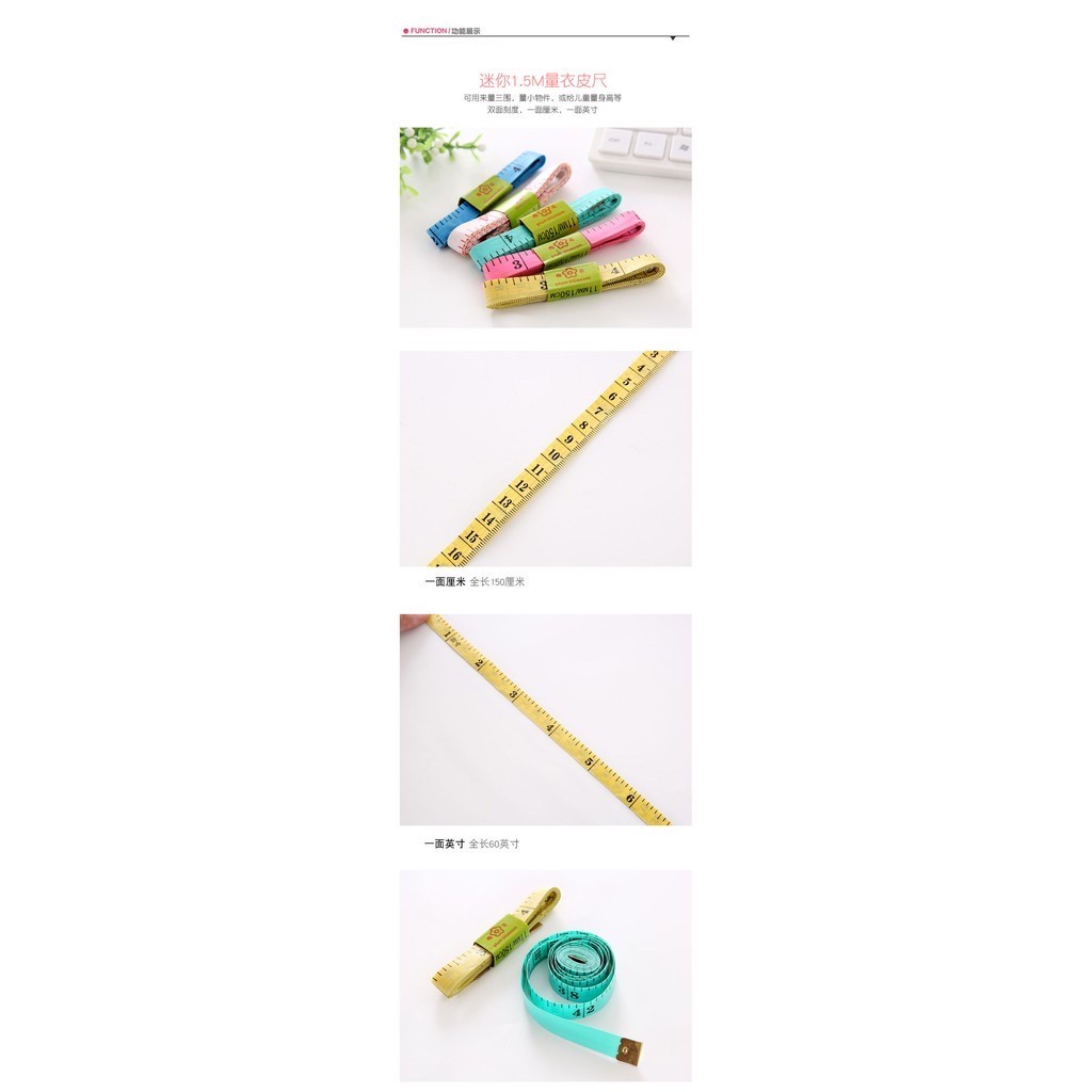 - Thước dây bản nhỏ đo lường 1,5m khá tiện lợi, trên thước chia vạch kích thước rõ ràng giúp bạn đo nhanh và chính xác các vật dụng chiều dài tương ứng.