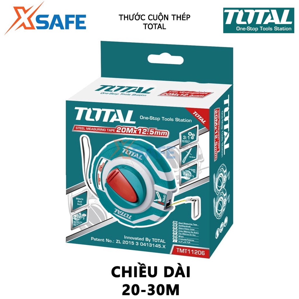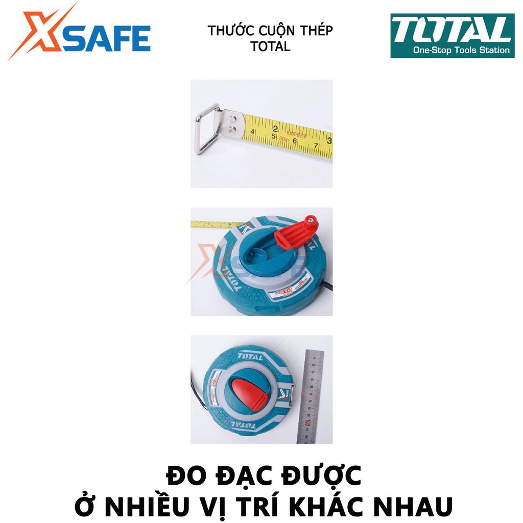 - Phần đầu dây thước được tích hợp khóa kim loại, giúp dễ dàng kéo ra khi đo, thật tiện dụng! Thước cuốn thép Total sử dụng thang đo hệ mét và inch, chi tiết và số đo được in rõ ràng trên lá thước, cho người dùng dễ dàng đọc kết quả đo.