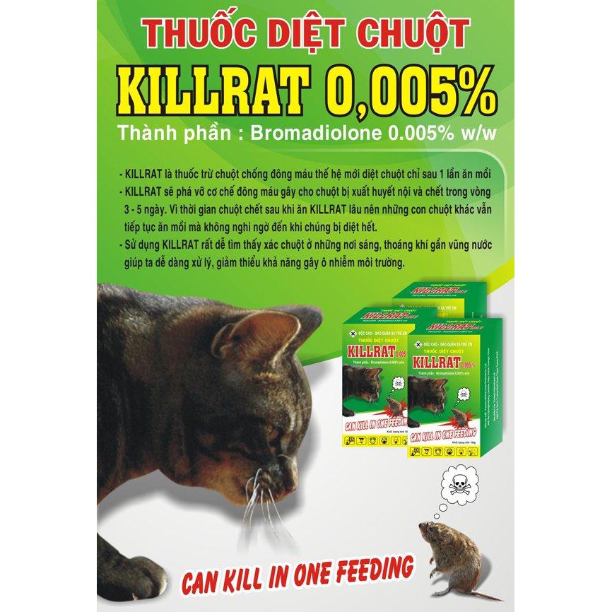 - Killrat là một trong những loại thuốc diệt chuột theo công nghệ chống đông máu thế hệ mới và có thể diệt chuột hàng loạt trong thời gian ngắn.