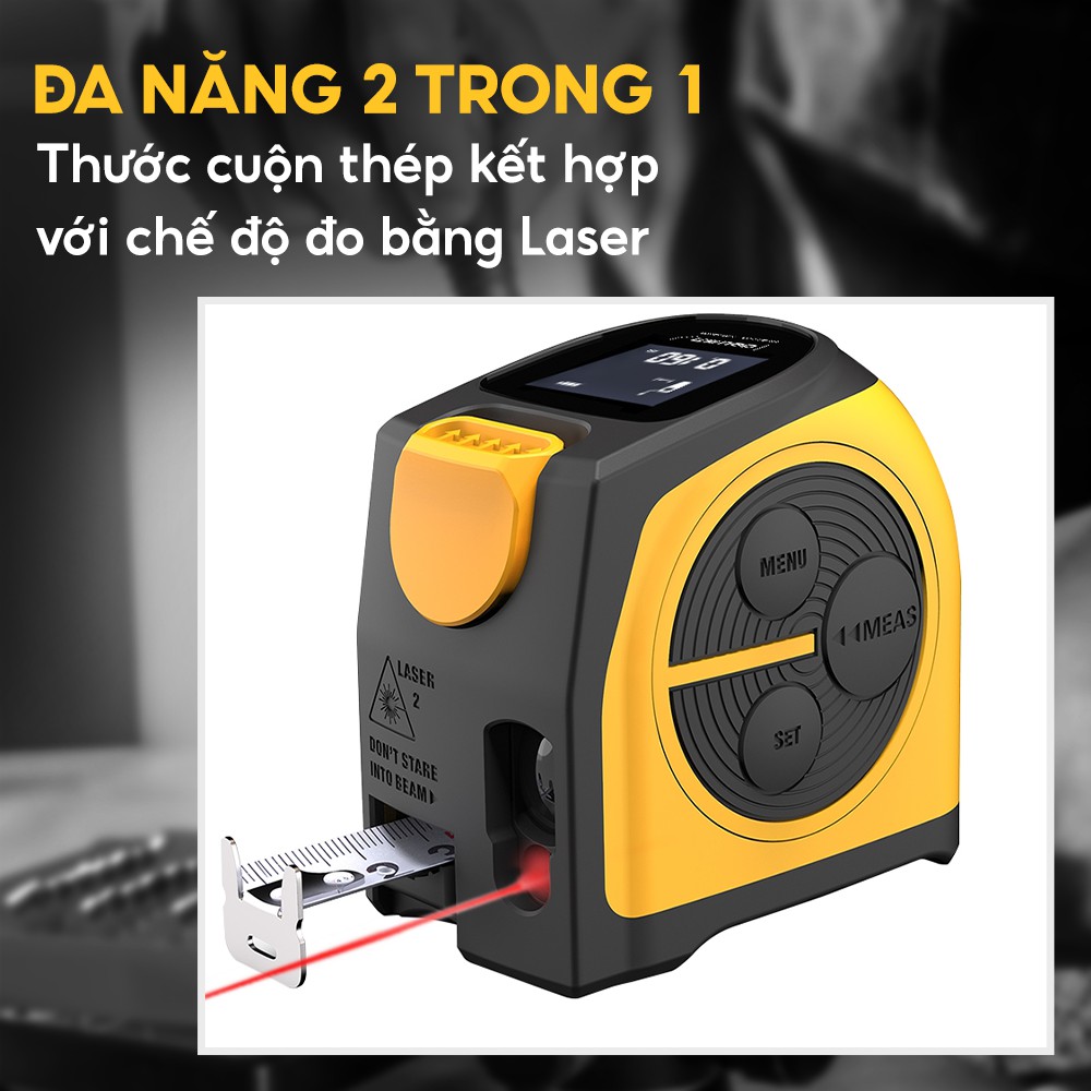 "THƯỚC ĐO ĐA NĂNG LASER CUỘN THÉP 2 TRONG 1 MÀN HÌNH KỸ THUẬT SỐ LCD DELIThước đo đa năng laser cuộn thép 2 trong 1 màn hình kỹ thuật số LCD Deli đáp ứng nhiều nhu cầu đo lường của bạn. Thước đo đặc biệt phù hợp cho thợ thủ công, đo lường trang trí hoặc ứng dụng trong các ngành xây dựng, trang trí nội thất, công trường và các nhu cầu khác trong cuộc sống. Đầu laser chính xác, cảm nhận chính xác dù chỉ là một chút thay đổi về khoảng cách cũng có thể cảm nhận được. Thước cuộn thép laser 2 trong 1 Deli đo khoảng cách xa bằng laser 40m với thước dây 5m để đo khoảng cách ngắn, cho phép bạn nhanh chóng đo khoảng cách thật đơn giản với cổng nhận và cổng phát bằng tia laser. Màn hình kỹ thuật số có đèn nền LCD giúp thước đo cuộn thép 2 trong 1 Deli có thể hoạt động bình thường trong môi trường tối để bạn nhìn rõ kết quả đo dù là ở ban đêm.