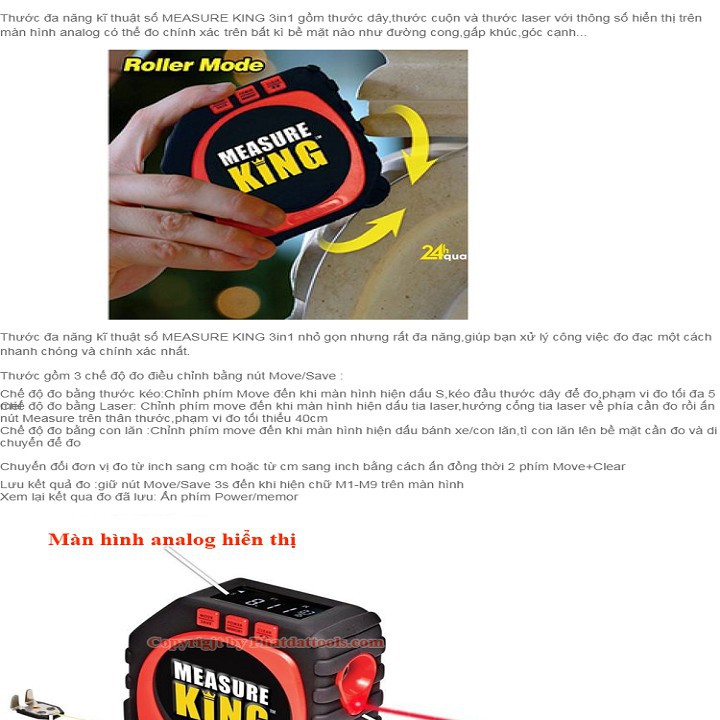 Thước đa năng kĩ thuật số MEASURE KING 3in1 gồm thước dây,thước cuộn và thước laser với thông số hiển thị trên màn hình analog có thể đo chính xác trên bất kì bề mặt nào như đường cong,gấp khúc,góc cạnh...