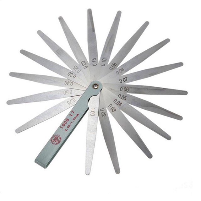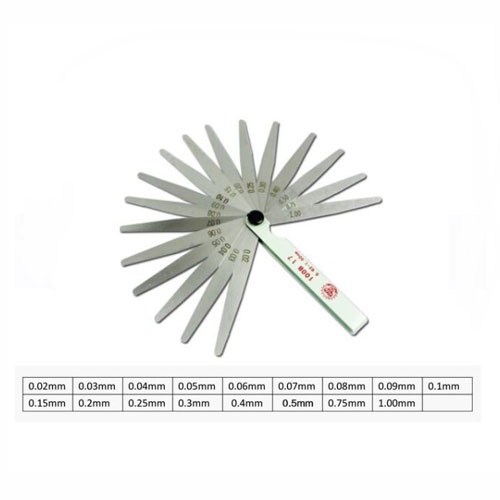 +Thước căn lá gồm 17 kích thước: 0.02 / 0.03 / 0.04 / 0.05 / 0.06 / 0.07 / 0.08 / 0.09 / 0.1 / 0.15 / 0.2 / 0.25 / 0.3 / 0.4 / 0.5 / 0.75 / 1 (mm)