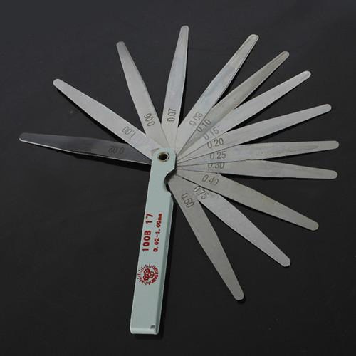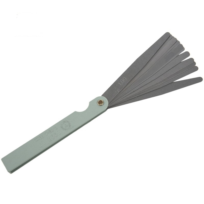 +Thước có 17 lá đo khe hở với độ chính xác cao dài 100mm, rộng 5~10mm dùng để xác định độ hở của khe hở bằng cách nhét từng lá thép từ dày đến mỏng, lá nào lọt vừa khít thì đó là kích thước khe hở.