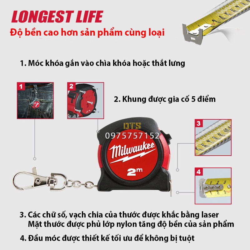 Thước kéo 2m cao cấp Milwaukee Mỹ siêu bền có móc chìa khóa, thước cuộn thép công nghiệp độ chính xác cao tuyệt đối