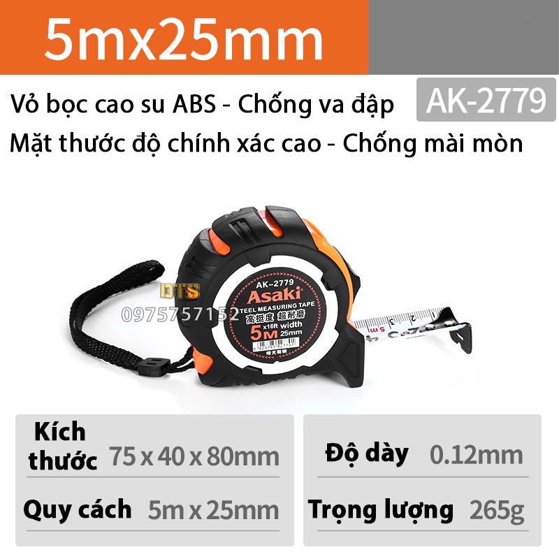 Thước kéo 5m chống va đập Asaki AK-2779, thước rút nền trắng số to rõ ràng, thước cuộn thép chính xác cao, vỏ bọc cao su