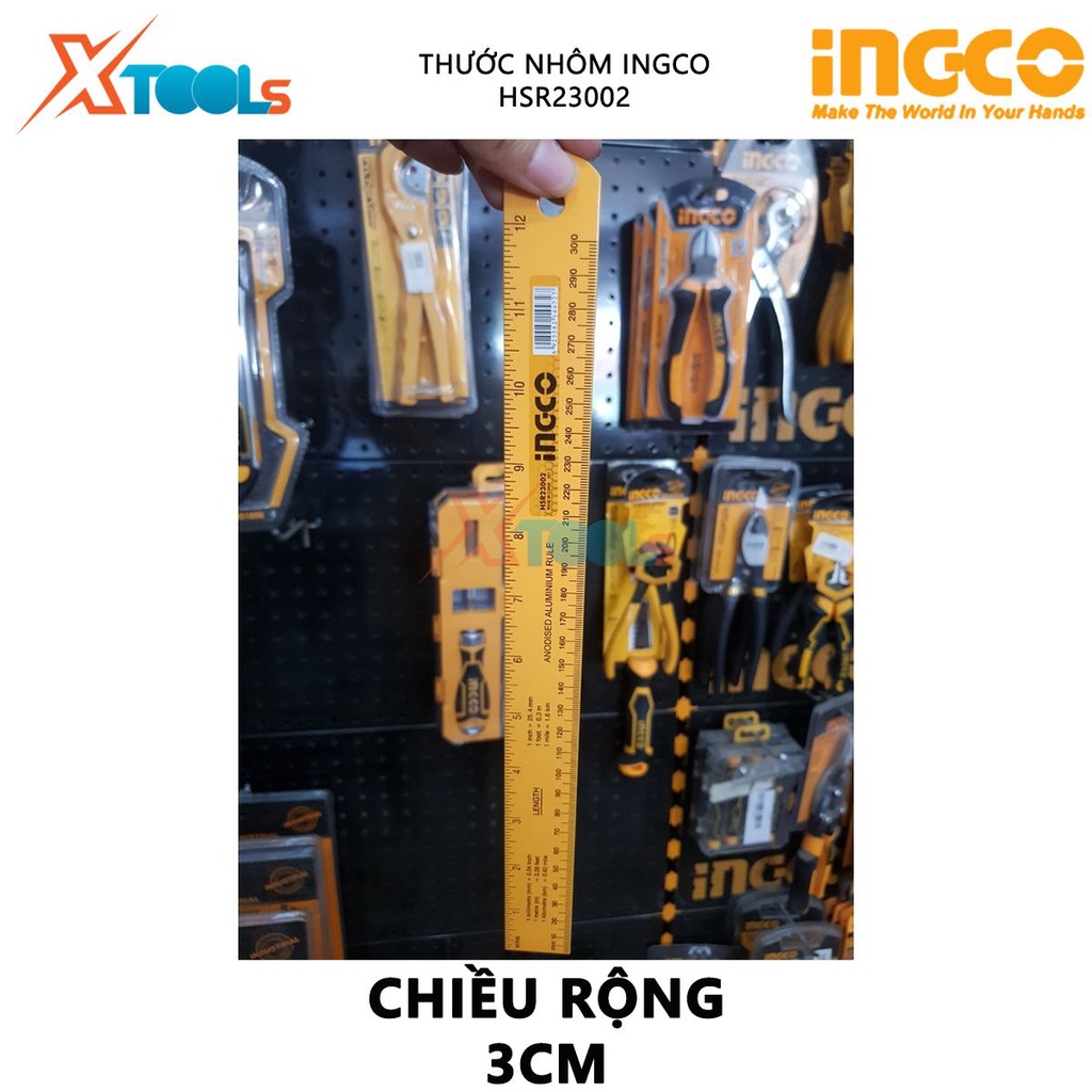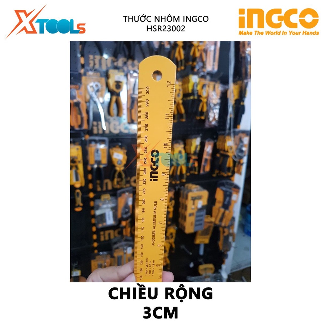 Giới thiệu Thước nhôm INGCO HSR23002 | thước lá chiều dài 30cm chiều rộng 3cm chất liệu nhôm anodized đo độ dài, chi tiết như trục,