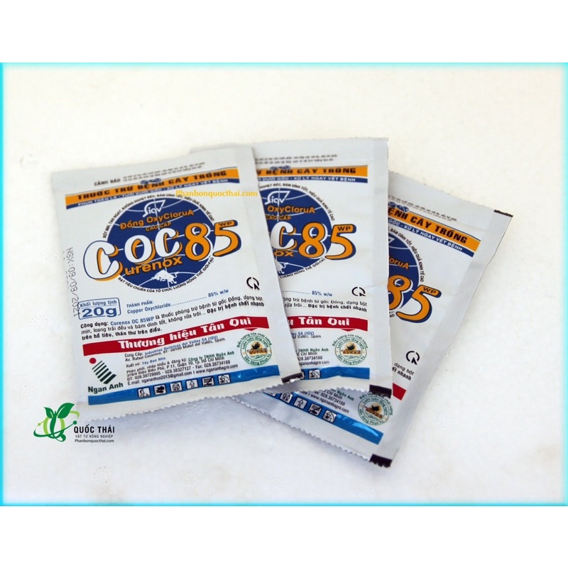 Chế phẩm trừ bệnh cây trồng COC85Công dụng: Phòng trị nấm bệnh, diệt vi khuẩn, tăng cường thêm vi lượng Đồng giúp cây phát triển tốt, tăng năng suất và chất lượng Là thuốc phòng trị nấm bệnh, diệt vi khuẩn căn bản từ gốc đồng qua hệ thống thân, lá và rễ dùng để phòng trị các bệnh hại như: thán thư trên cây xoài, sương mai trên cây cà chua, sẹo các loại cây có múi, cây ăn trái, cây công nghiệp… Ngoài việc phòng trị, Coc 85WP còn cung cấp vi lượng đồng giúp tăng năng suất và chất lượng nông sản. Coc 85WP ít độc cho ong, cá, gia súc, gia cầm, con người và không ảnh hưởng đến môi trường sinh thái. Hướng dẫn sử dụng: Pha 10 – 20g cho bình 8L, 400 – 600L/ha, phun khi bệnh chớm xuất hiện, nên phun cách nhau 7 – 14 ngày để phòng và trị nấm bệnh tấn công.