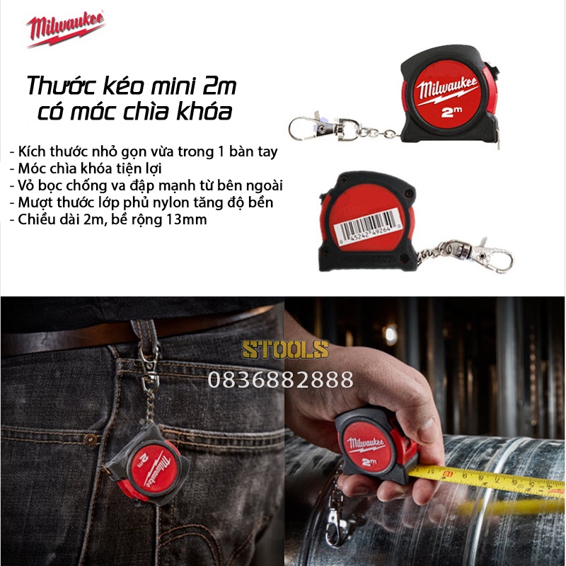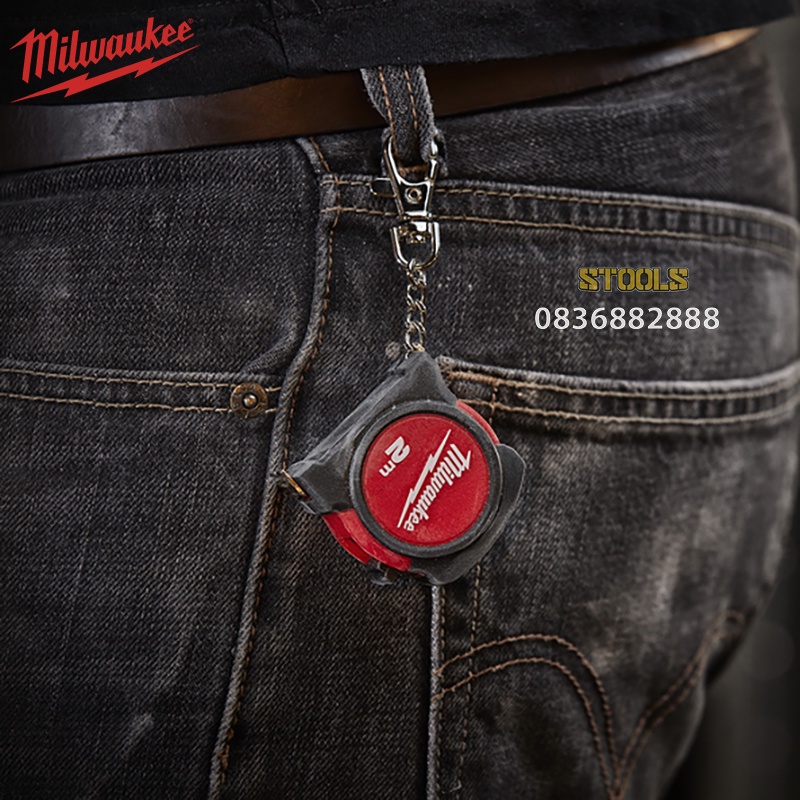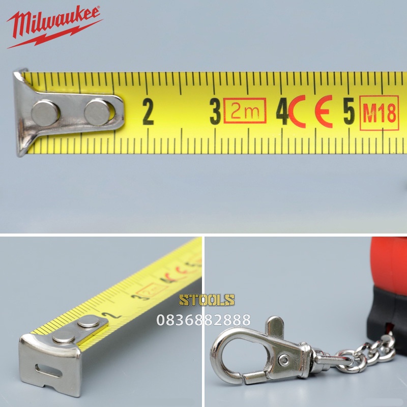 Thước rút 2m có móc chìa khoá Milwaukee chính hãng Mỹ siêu bền, thước cuộn thép công nghiệp độ chính xác chuyên nghiệp