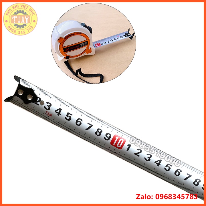 Phần đầu dây thước được tích hợp khóa kim loại, giúp dễ dàng kéo ra khi đo, thật tiện dụng, Thước cuốn thép sử dụng thang đo hệ met và inch, chi tiết và số đo được in rõ ràng trên lá thước, cho người dùng dễ dàng đọc kết quả đo.