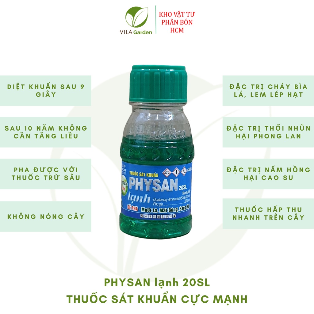 Thuốc Sát Khuẩn Trừ Nấm Bệnh PHYSAN 20SL (Lọ 100ml), Physan lạnhThuốc sát khuẩn Physan 20SL là loại thuốc có tính sát khuẩn, kháng khuẩn cực mạnh chuyên đặc trị các bệnh vàng lá, thối nhũn, thối thân, thối hạt cho các loại cây trồng. Đặc biệt với cây hoa Lan.