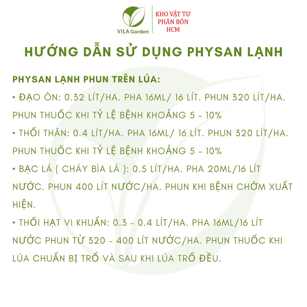 – Pha một muỗng canh Physan 20sl với 4 lít nước, ngâm chậu, khay,… trong thời gian 10 phút, đối với khuôn viên vườn thì ta xịt.