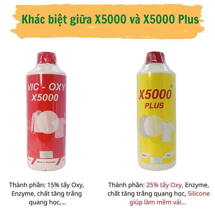 - Điểm khác biệt lớn giữa 2 sản phẩm X5000 và X5000 Plus: X5000 Plus với 25% tẩy oxi so với 15% tẩy oxy từ X5000 giúp tẩy bỏ các vết bẩn cực mạnh, giúp quần áo trắng sáng hơn. Sản phẩm có chứa thêm hợp chất Silicone giúp làm mềm sợi vải tốt nhất.