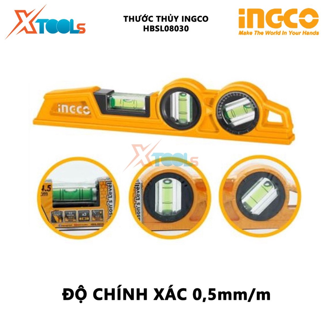 - Thước thủy 24.5 cm INGCO HBSL08030 có vẻ ngoài nhỏ gọn, màu sắc tươi và nổi bật. Đây được xem là một thiết bị không thiếu đối với người thợ lành nghề, tất nhiên nó cũng khá phổ biến trong các dụng cụ sử dụng tại gia đình. Sản phẩm không chỉ có trọng lượng nhẹ mà còn được thiết kế nam châm ở giữa để tạo thế cân bằng, giúp việc sử dụng được thuận tiện hơn.