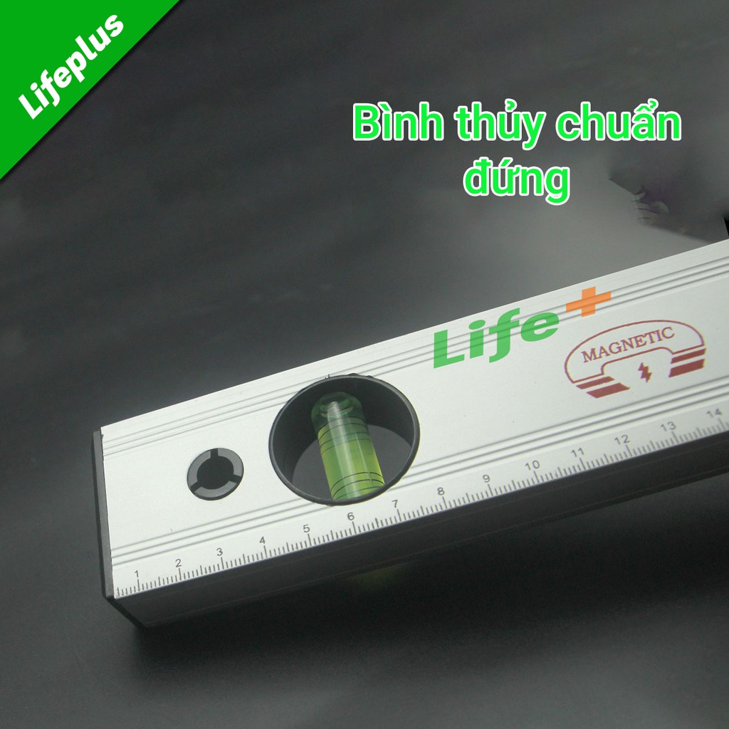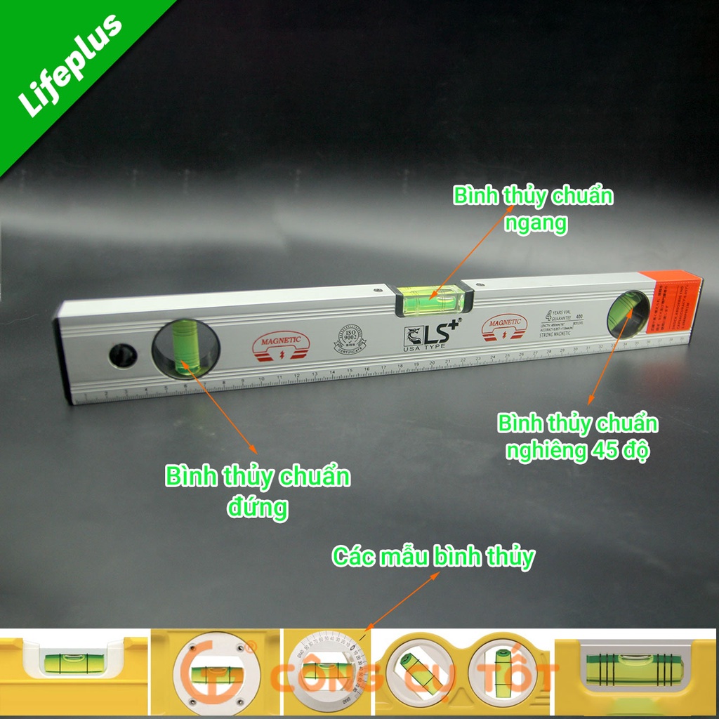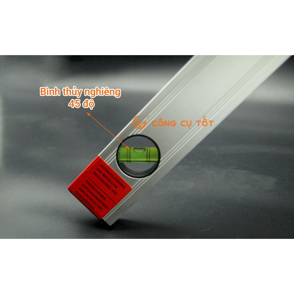 Chiều dài thước: 30cm,40cm,50cm,60cm, 80cm với 3 ống thủy được cố định theo chiều ngang, dọc và nghiêng 45 độ so với phương ngang