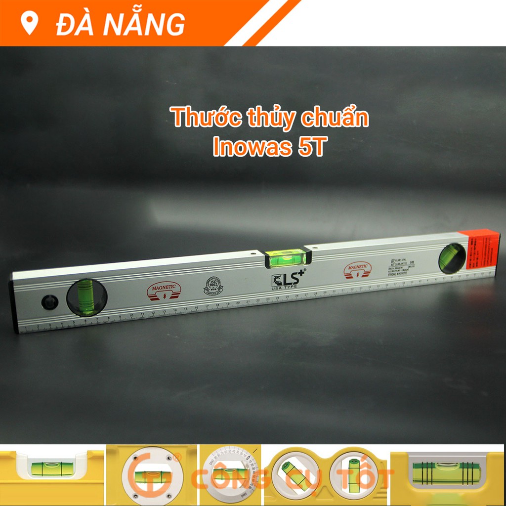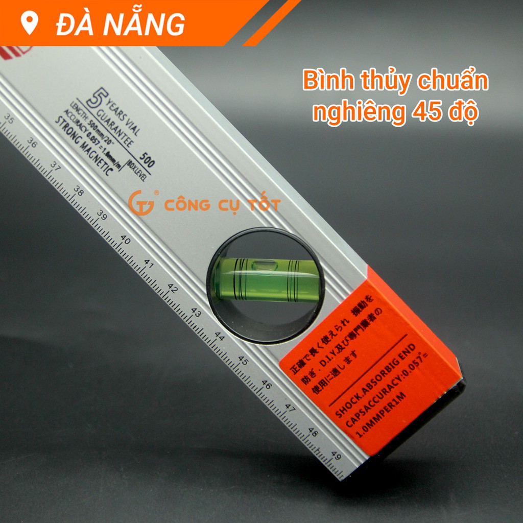 Chiều dài 50cm,với 3 ống thủy được cố định theo chiều ngang, dọc và nghiêng 45độ so với phương ngang