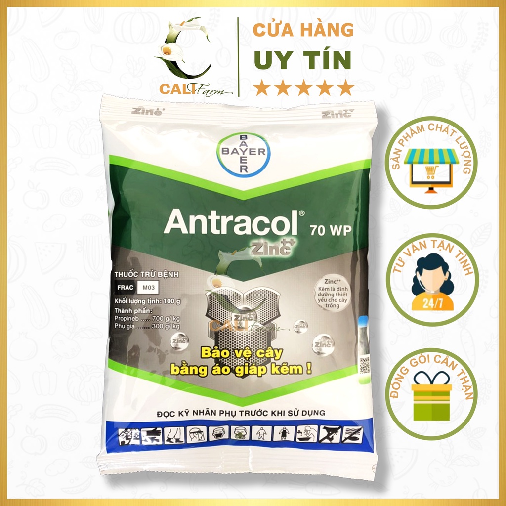 - Với hoạt chất Propineb - 700g/ kg, Antracol là thuốc trừ bệnh phổ rộng trên nhiều loại cây trồng. Rất an toàn cho cây, phun được ngay cả giai đoạn ra bông. 1 kg Antracol chứa 150g kẽm tinh khiết cho cây → mặc áo giáp kẽm cho cây..